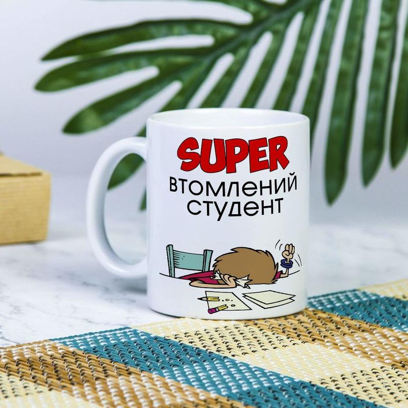 Белая чашка на подарок с надписью "супер уставший студент" 330 мл