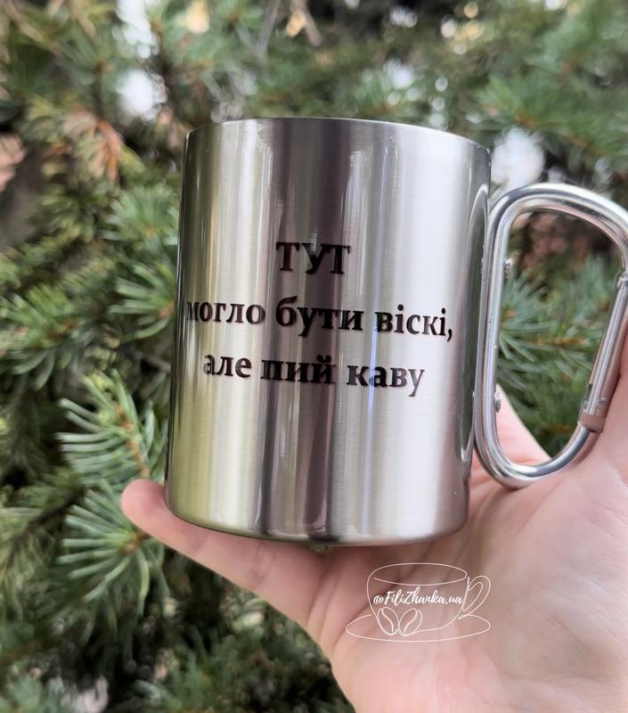 Металева чашка з ручкою-карабіном⛓️Виконана з нержавіючої сталі, має подвійні стальні стінки, за рахунок чого довше зберігає тепло🔥 💸Ціна: 380 грн (стандартне пакування) 💸Ціна: 405 грн (подарункове пакування🎁) Дизайн зробимо будь-який (емблема бригади, позивний, надпис, фото - вартість буде така сама) Відправка Новою Поштою/Укрпоштою Є оплата на рахунок ФОП, наложка по передоплаті або Безпечна Оплата на Шафа.Юа