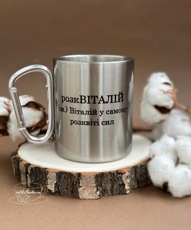 Металева чашка з карабіном, чашка іменна, чашка з іменем віталій (можемо зробити з будь-як...