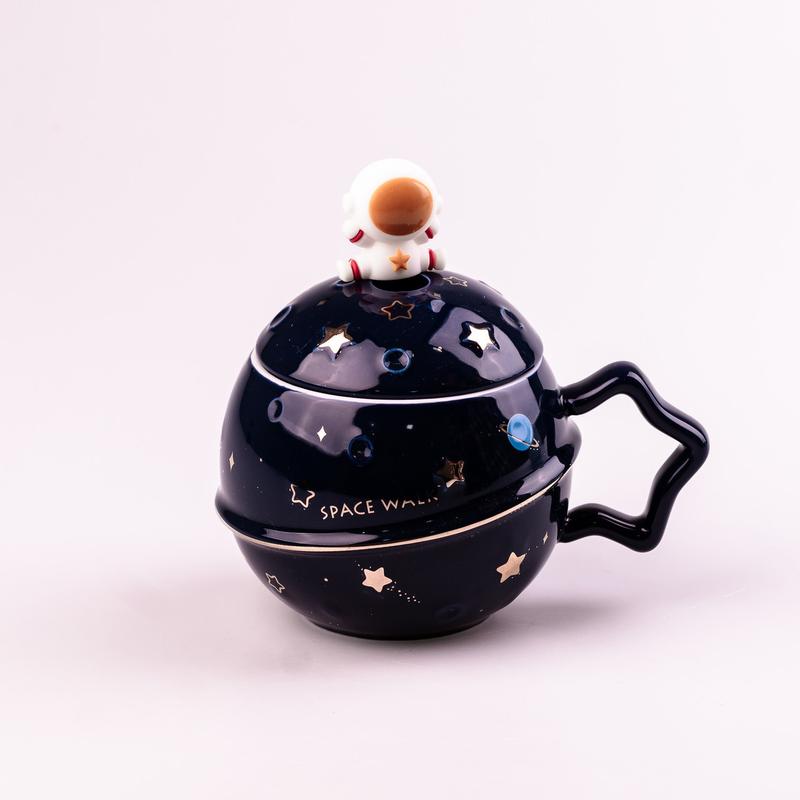 Чашка керамическая 400 мл астронавт с крышкой и ложкой темно-синий dm-11