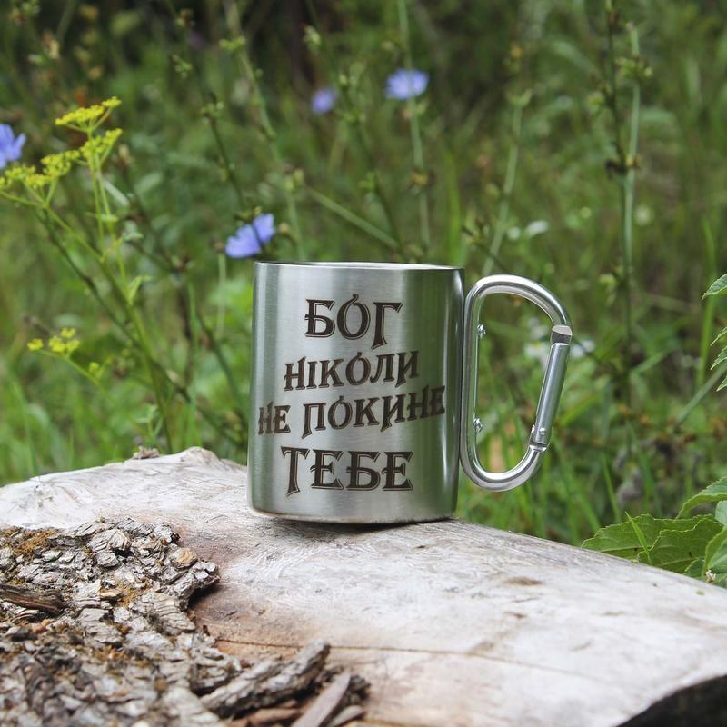 Металлическая чашка 250 мл с карабином и гравировкой - бог ніколи не покине тебе