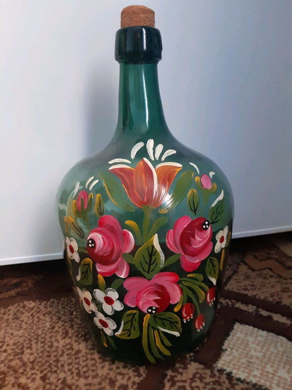Тип посуду: Пляшки Матеріал: Скло Продаю трьохлітрову пляшку, оздоблену чудовим візерунком ( фарба , нанесена на скло ). Хороший варіант для довершення інтер'єру закладу харчуванння, або домашньої колекції. Пересилаю.