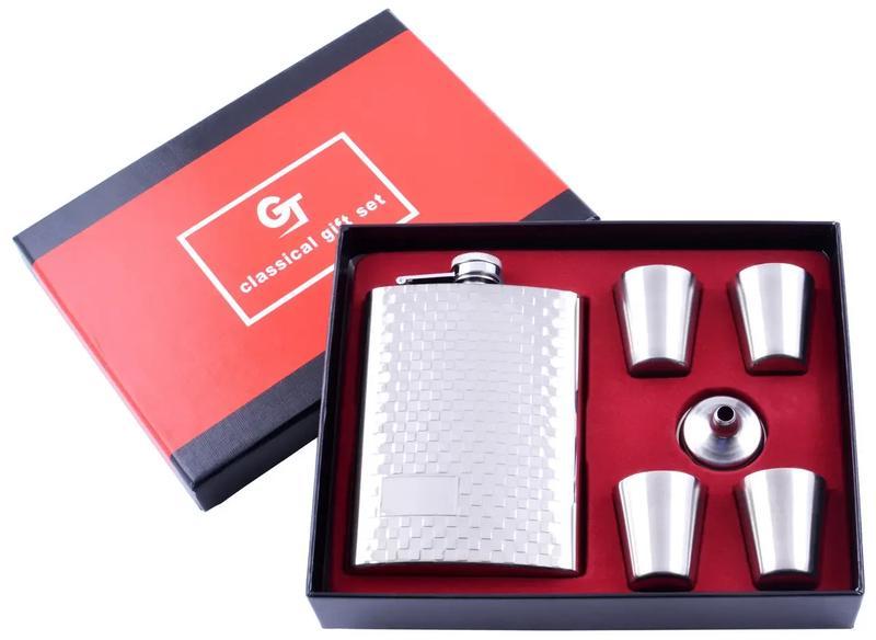 Кілька примірників у наявності Подарунковий набір з флягою - - Фляга (Об'єм: 236 мл) - - 4 чарки (Об'єм: 70 мл) - - лійка Продається гуртом та в роздріб з доставкою по Україні Країна виробник: Китай Призначення фляги: Для алкогольних напоїв Форма: Прямокутна Стан: Новий Стопка: 4 шт. Воронка: Так