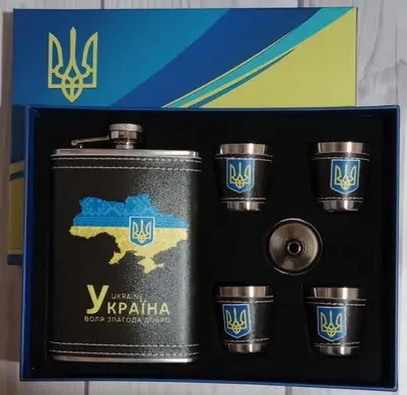 Кілька примірників у наявності Подарунковий набір 6в1 - - Фляга обтягнута шкірою (Об'єм: 9 Oz/265 мл) - - 4 чарки обтягнуті шкірою (Об'єм: 30 мл) - - Лійка Продається гуртом та в роздріб з доставкою по Україні Країна виробник: Китай Призначення фляги: Для алкогольних напоїв Форма: Прямокутна Стан: Новий