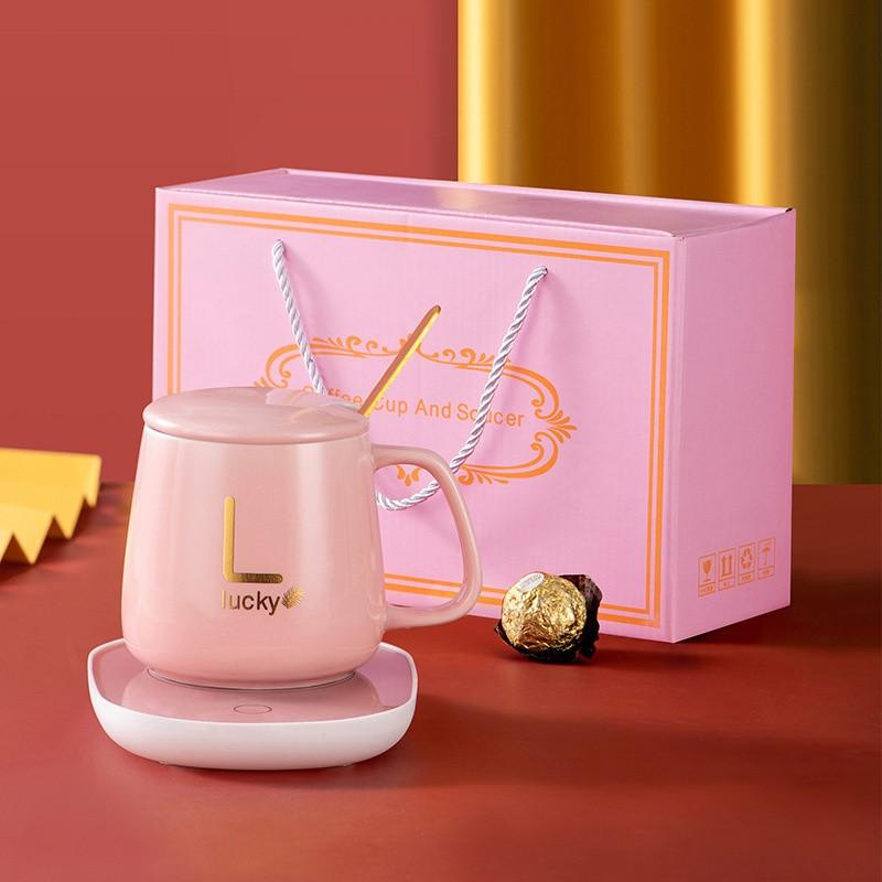Чашка 350мл на подставке с подогревом до +55 °с, розовая чашка керамическая с ложкой в по...
