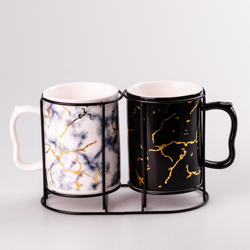 Набор керамических чашек 350мл с мраморным узором на подставке 2 штуки ep