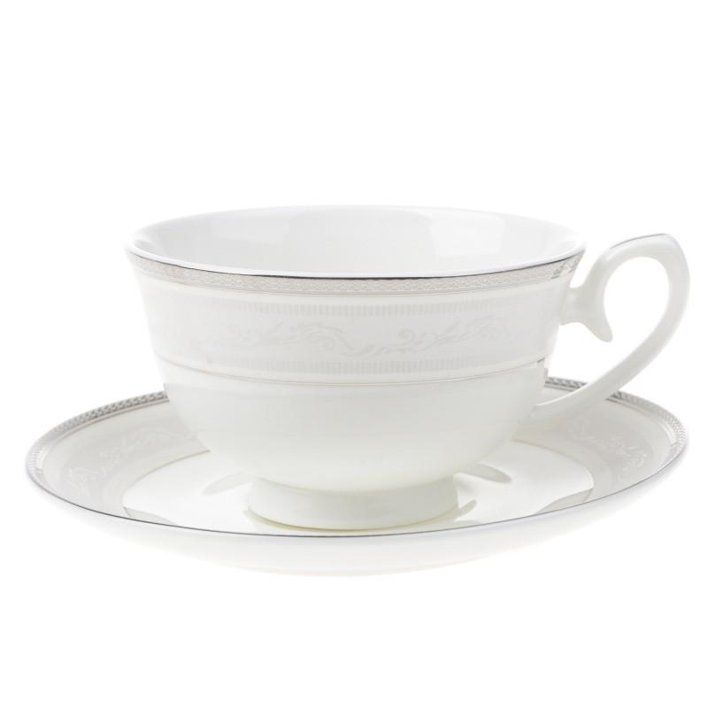 Чашка з блюдцем Силен обов'язково прикрасить ваш стіл. Набір виготовлений з кістяної порцеляни, яка відрізняється тонкістю, білосніжним кольором і міцністю. Цей матеріал містить в собі каолін, польовий шпат, глину, кварц і кістяне борошно. Комплект декорований візерунком сріблястого кольору. Уявіть, як ви насолоджуєтеся ароматним напоєм і зовнішнім виглядом посуду. Ви можете купити чашку з блюдцем окремо або в комплекті з сервізом, в який також входять чайник, цукорниця і молочник.