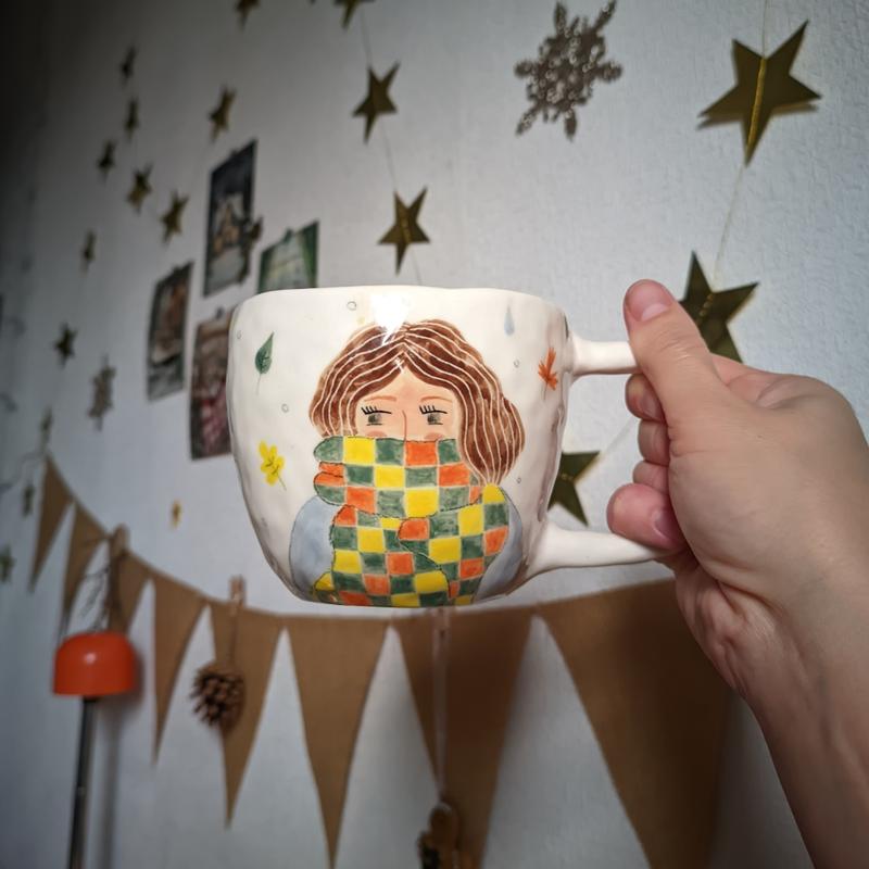 Чашка ручной работы, девочка в шарфике 370 мл керамика, подглазурная роспись последнее фото: пару микро пропусков в глазури, не заметно, ни на что не влияет и на ручке видно трещинку - на функциональность не влияет, она наружная и под глазурью