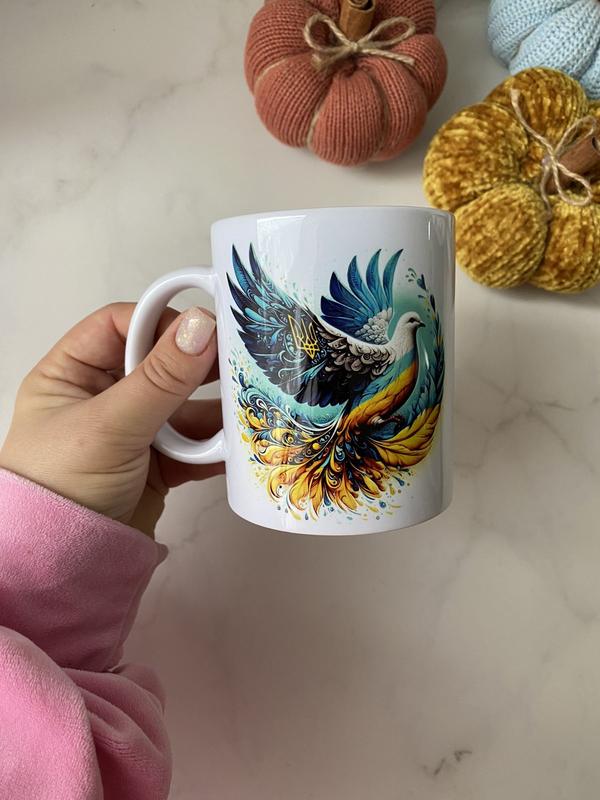 Чашка з принтом голуб Об'єм чашки 330 мл. Чашка з сублімаційним принтом. Чудовий подарунок на будь-яке свято. Можливість переносу на чашку будь-який інший задум: фото, надпис, картинку. Або можем підібрати макет, спеціально для вас. Великий вибір чашок, з кольоровим обідком, з кольоровою серединою, чашки хамелеони. Зображення, яке наноситься на чашку розраховане на тривалий термін використання, не стирається, не вигоряє Доставка по Україні Новою поштою, Укрпоштою, Міст Експрес. Термін виконання 24 години.