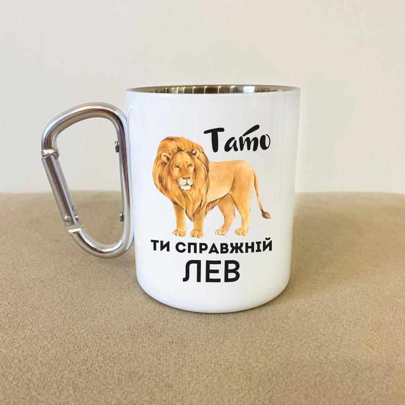 Кружка металева з карабіном "тато ти справжній лев" 300 мл біла
