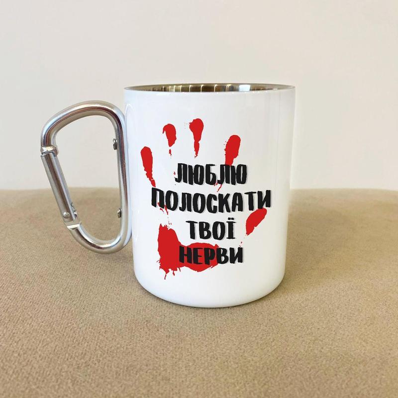 Кружка металева з карабіном "люблю полоскати нерви" 300 мл біла |швидка доставка|
