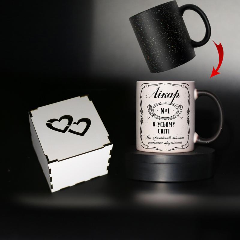 Чашка хамелеон черная "Лікар №1" Чашка Хамелеон станет отличным подарком, от которого все точно будут в восторге. Бюджетная цена, индивидуальное оформление, быстрое изготовление. Воплотим все Ваши фантазии: можно добавить фото и изменить текст. - Цена чашки с деревянной коробочкой - 420 грн - Изготовление - 2-4 дня - Доставка Новой Почтой Качество чашки PREMIUM: - Объем: 330 мл - Высота: 95 мм - Диаметр: 82 мм - Вес: 350 гр - Нанесение изображения: сублимационное - Материал: керамика