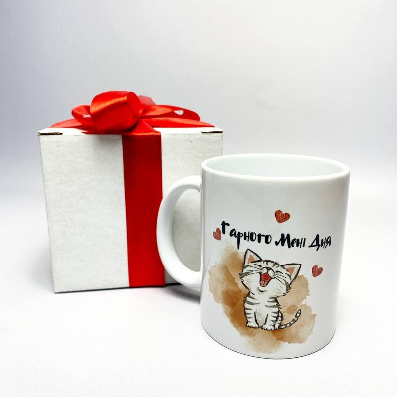 Кружка керамічна з принтом "гарного мені дня" 330 мл у подарунковій коробці з бантом
