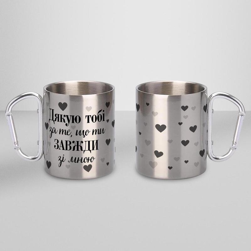 Кружка металева з карабіном "дякую тобі за те, що ти завжди зі мною" 300 мл срібляста|швид...