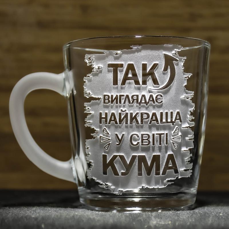 Чашка для чаю та кави з гравіюванням Так виглядає Найкраща у світі Кума в подарунковій коробці Високоякісне нанесення малюнка: - механічне гравіювання скляної поверхні - об'ємне, тактильне на дотик, - не змивається, витримає будь-яку кількість мийок в посудомийній машині та будь-якими засобами - цілком екологічно, при виготовленні не застосовуються токсичні фарби та розчинники Що робить наші чашки такими особливими? - Гравіювання з характером: Напис вигравіюваний не лазером, не є наліпкою або нафарбованим, а нанесений на скло з використанням особливої технології механічної обробки. Це створює відчуття рельєфу та об'ємності зображення, що надає чашці деякої чарівності. - Елегантний дизайн: Стильний дизайн надає чашкці особливого шарму і виділяє її серед звичайних скляних виробів. - Високоякісне скло: Наша чашка виготовлена із прозорого скла найвищої якості, що забезпечує максимальну ясність сприйняття кольору вашого улюбленого напою. - Ідеальний подарунок: Ця чашка надсилається у стильній подарунковій коробці, що робить її вже готовою до вручення та святкування. Термін виготовлення чашки 1 день До декору можемо додати коротке побажання, ім'я або будь-який інший напис. Зробіть Ваш подарунок іменним для тата, сина, брата, дідуся, для близької Вам людини! Якщо Ви не знайшли необхідне зображення, текст, лого, шеврон тощо - зверніться до нас, і ми виправимо ситуацію, ми підготуємо дизайн та виготовимо індивідуальну подарункову чашку згідно Ваших побажань.