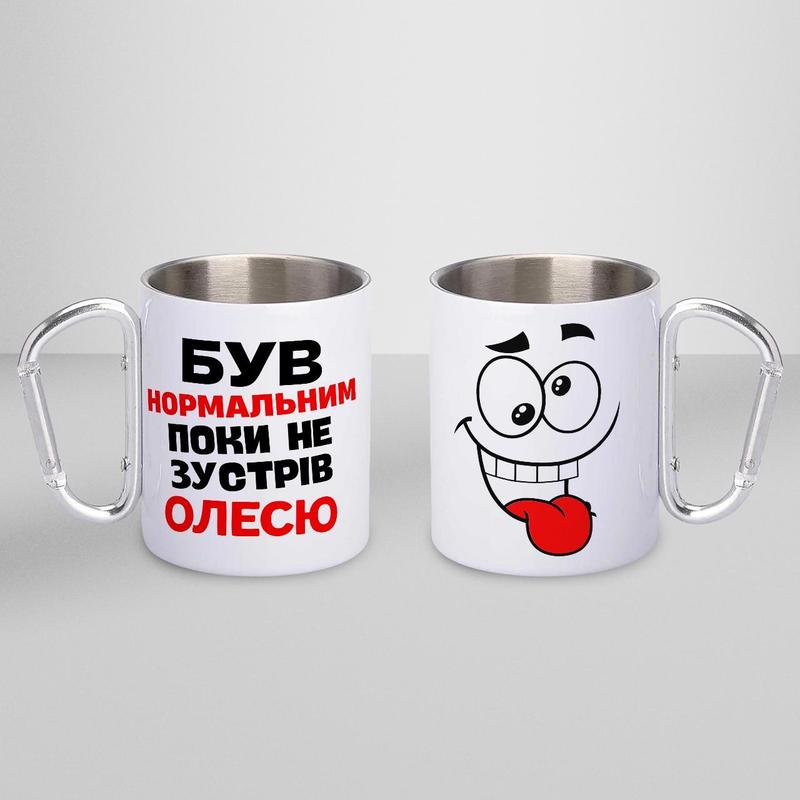 Кружка металева з карабіном "був нормальним поки не зустрів олесю" 300 мл біла|знижка|