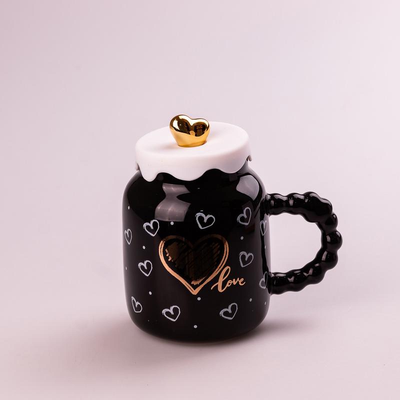 Кружка керамическая 400 мл с крышкой черная с белыми сердечками