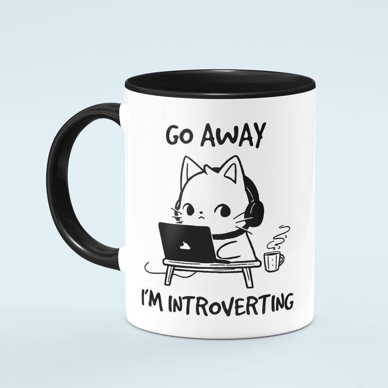 Эта кружка идеально подойдет для тех, кто ценит своё личное пространство и время наедине с собой. С милым котиком за ноутбуком и надписью "Go Away, I'm Introverting", эта кружка станет отличным подарком для интровертов, геймеров и тех, кто предпочитает работать удаленно. Она выражает стиль и настроение, добавляя немного юмора в повседневные моменты. Черный кант и ручка подчеркивают минималистичный и стильный дизайн.