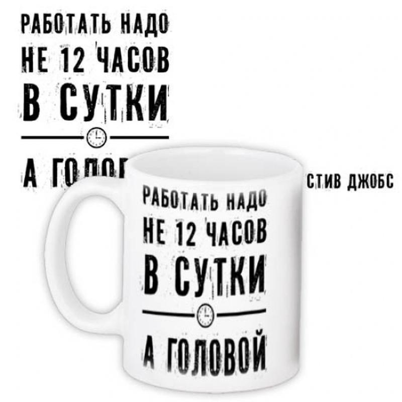Чашка Работать надо головой Характеристика Кружка: белая глянцевая Размер запечатки: 19x9,5 см Печать: полноцветная, технология гравертон.