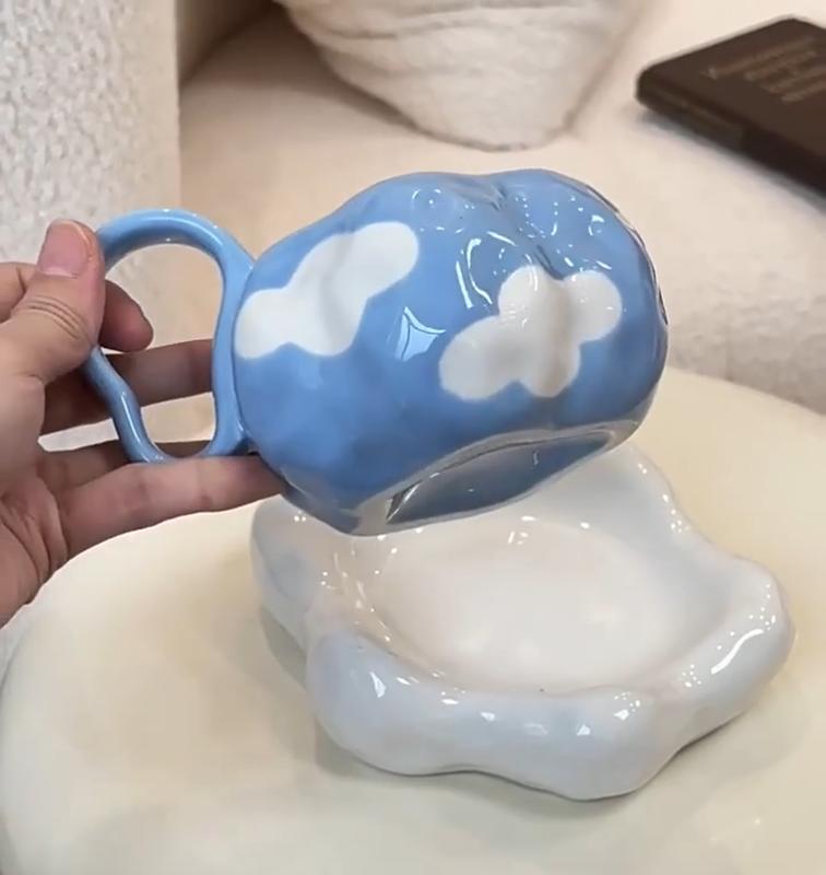 Керамический набор чашка и блюдце в виде тучек Набор керамических чашек для кофе с ручной росписью "Синее небо и облака" Необычная чашка для кофе для домашнего использования Десертная тарелка с облаками Визуально привлекательное маленькое украшение для хранения Большая емкость Милая чашка для латте-арта для послеобеденного чая - Подходит для микроволновой печи Без свинца, 3D, Набор для чая, Лучший на Рождество