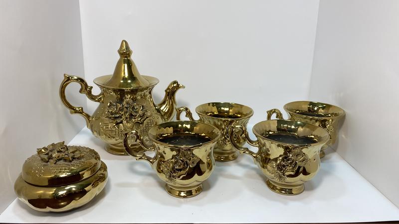 Продам красивый позолоченный сервиз, чайник, сахарница, 4 чашки. долго стоял в серванте без использования.