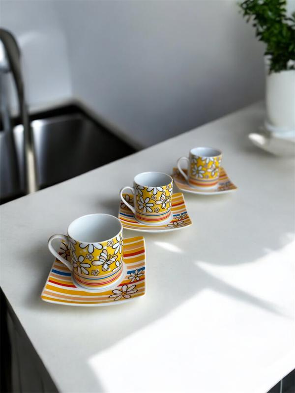 Продаю красивый, яркий набор чашечек от Royal Ceramics England. Очень милые, с цветочным принтом и цветными полосками - создают солнечное настроение каждое утро! Идеально для кофе или эспрессо. Объем каждой чашечки – 70 мл, высота – 5.5 см, диаметр – 5 см. В комплекте идет фирменное квадратное блюдце в таком же цветном дизайне. Есть три комплекта (чашка + блюдце). Можно купить один, два или все вместе – как вам удобно. Состояние отличное, посуда не бился, не трескал. Есть лишь небольшой скол на одном блюдочке (показала на последнем фото). На использование не влияет. Цена указана за один комплект, но если берете больше — сложи скидку. Пишите, ответьте быстро! Открытка возможна Укр-почтой и Новой почтой.