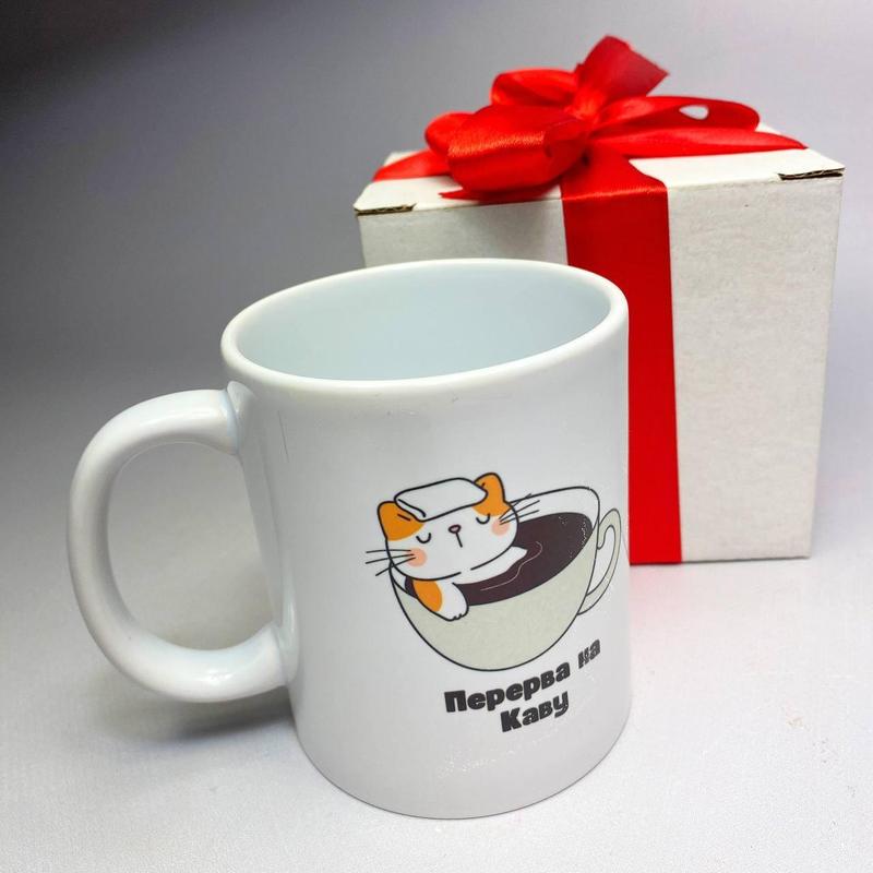 Кружка керамічна з принтом "перерва на каву" 330 мл у подарунковій коробці з бантом