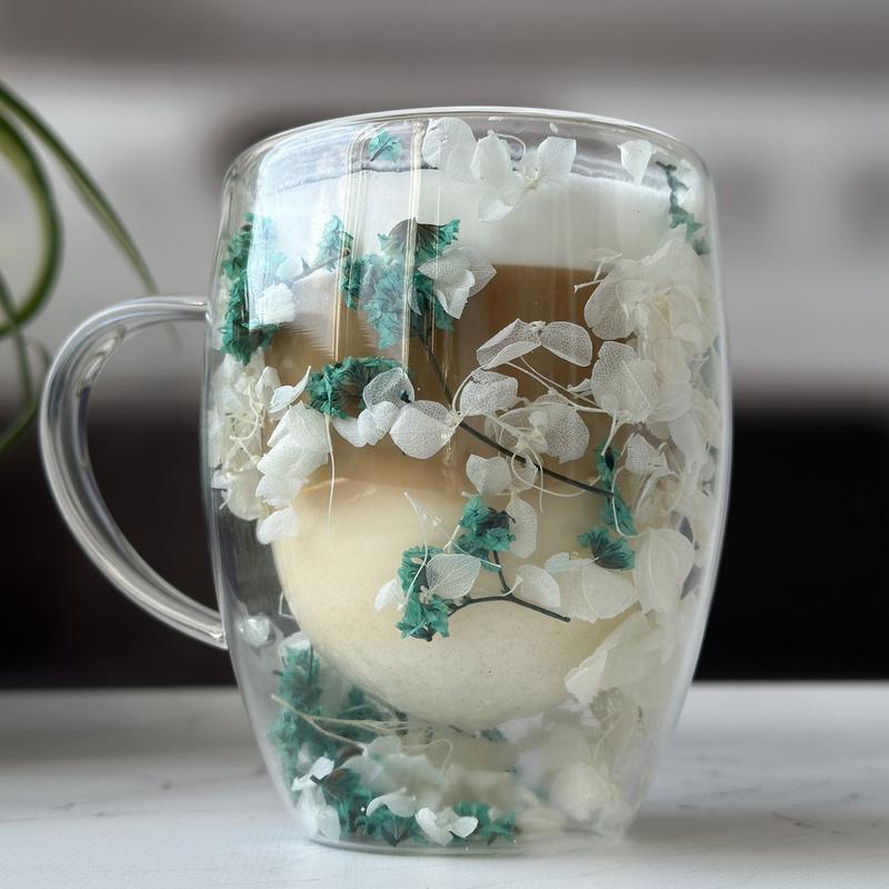 Чашка з ручкою "Сухоцвіти" з подвійними стінками, біло-синя, 350 мл Кружка із сухоцвітами створює неповторний декоративний ефект, перетворюючи кожне чаювання на маленьке свято... Чашки із подвійними стінками з якісного боросилікатного скла вирізняються термостійкістю (від -20 до +150 °C) і підтримують температуру напоїв - і холодних, і гарячих - упродовж тривалого часу. Об'єм 350 мл є оптимальним як для подавання улюбленої кави. Важливо пам'ятати, що миття чашки в посудомийній машині не рекомендовано.