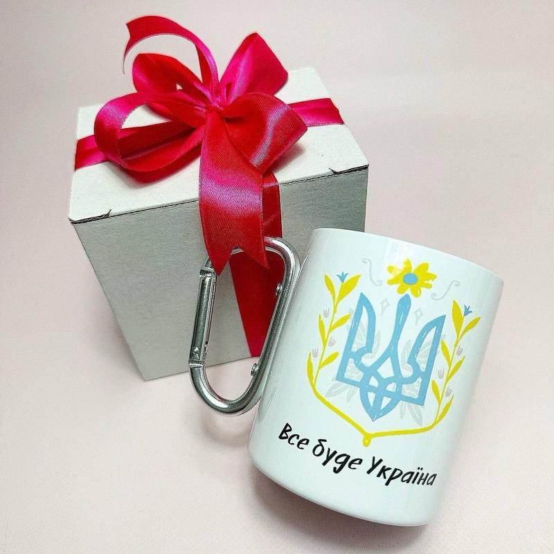 Кружка металева з карабіном "все буде україна" 300 мл у подарунковій коробці з бантом |шви...
