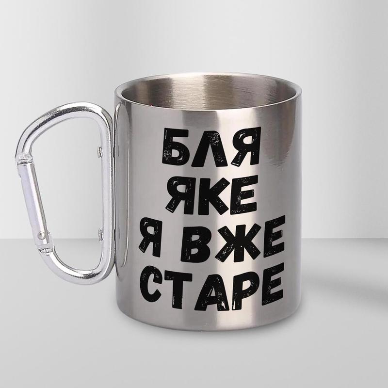 Кружка металева з карабіном "яке я вже старе" 300 мл срібляста |швидка доставка|