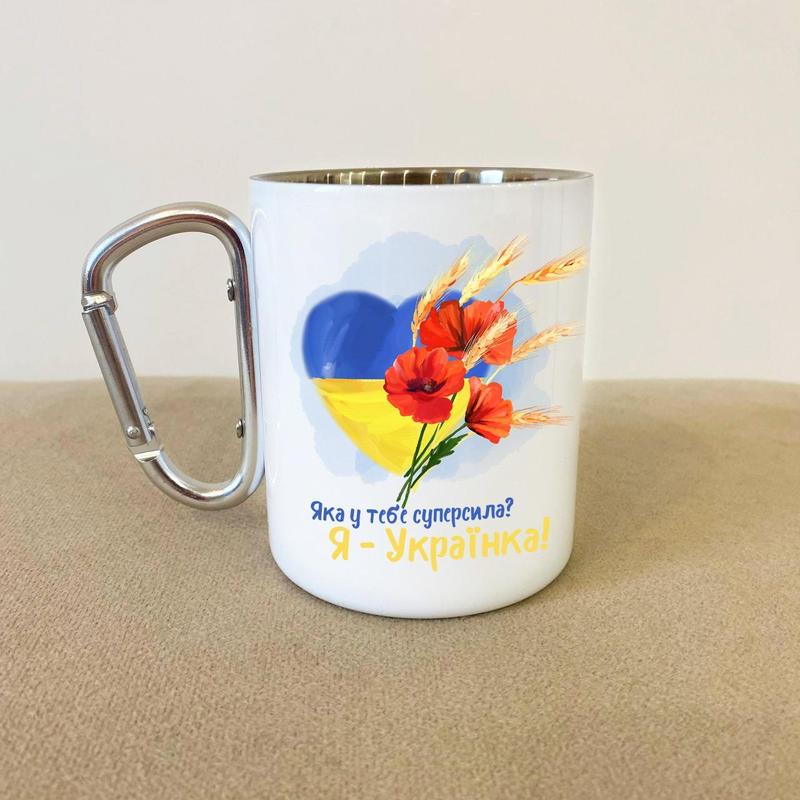 Кружка металева з карабіном "супер сила українка" 300 мл біла|швидка доставка|
