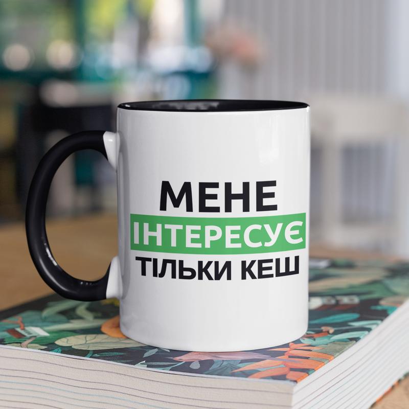 Чашка керамічна з принтом "мене інтересує тільки кеш" 330 мл, біла з чорною ручкою