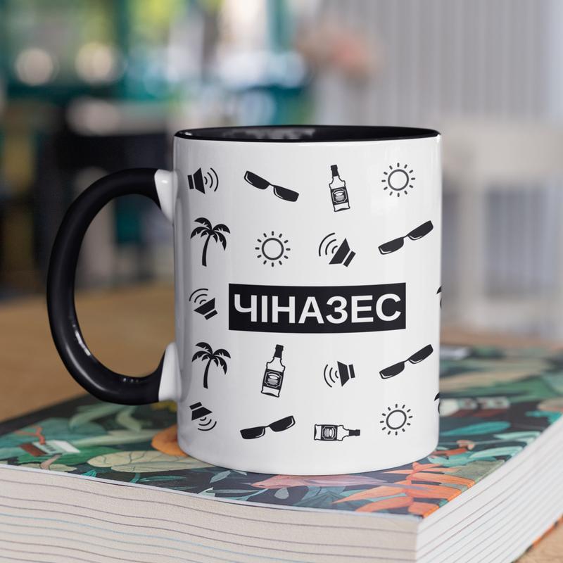 Чашка керамічна з принтом "чіназес" 330 мл, біла з чорною ручкою