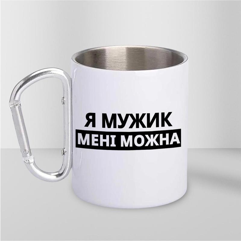 Чашка металева з принтом "я мужик мені можна" 300 мл з карабіном, біла