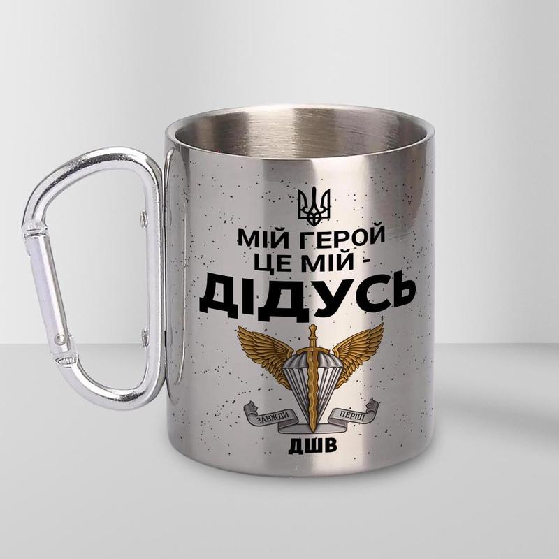 Чашка металева з принтом "мій герой це мій дідусь" 300 мл з карабіном, срібляста
