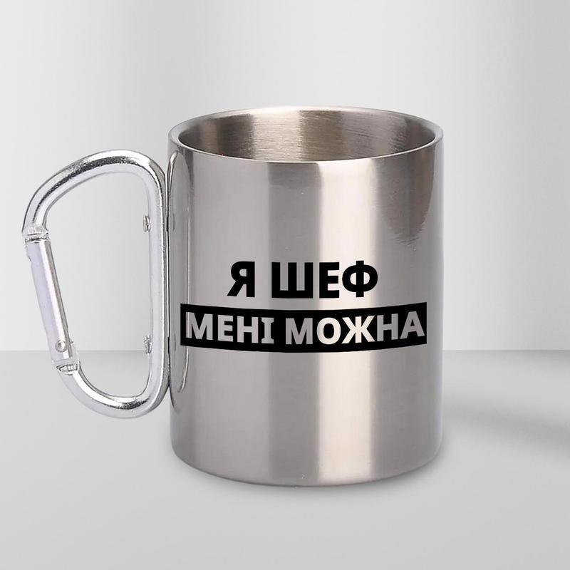 Чашка металева з принтом "я шеф мені можна" 300 мл з карабіном, срібляста