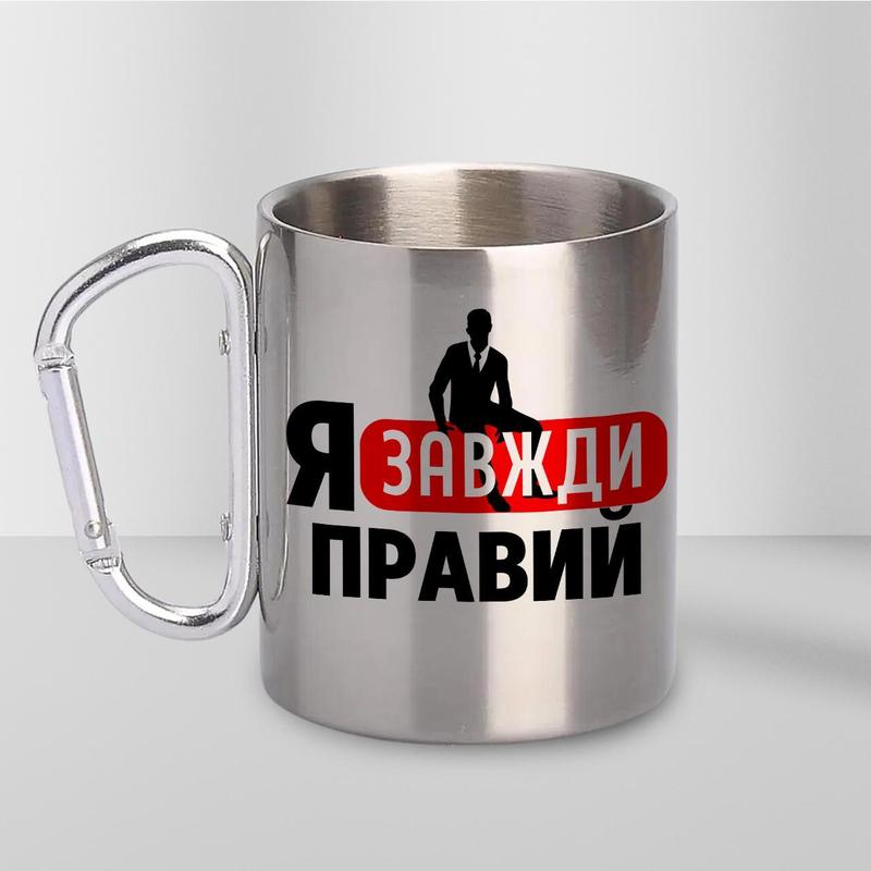 Чашка металева з принтом "я завжди правий" 300 мл з карабіном, срібляста