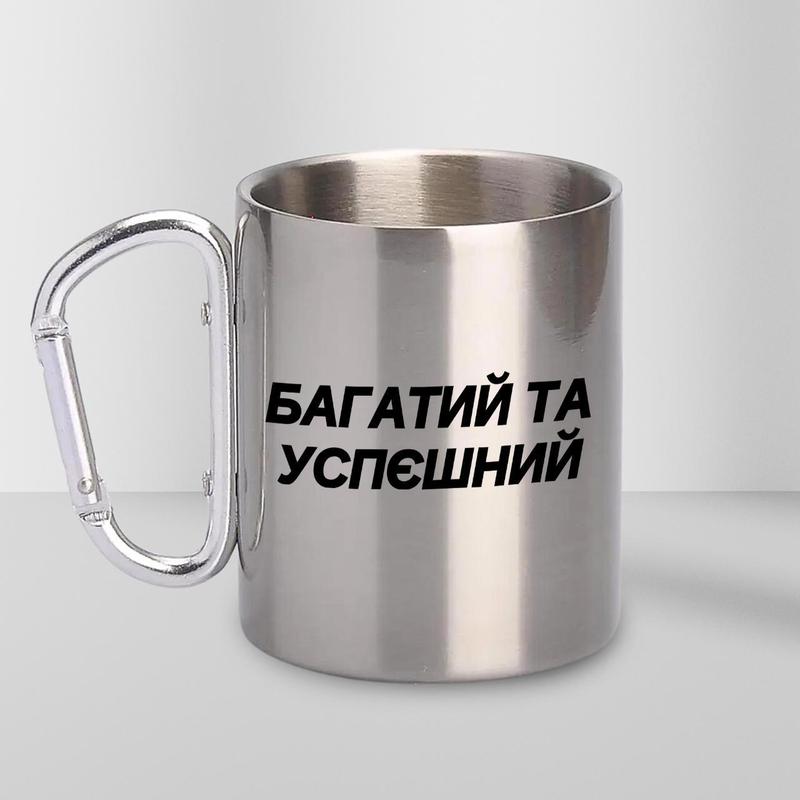 Чашка металева з принтом "багатий та успєшний" 300 мл з карабіном, срібляста