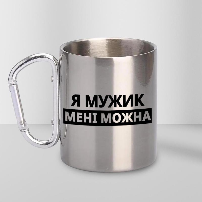 Чашка металева з принтом "я мужик мені можна" 300 мл з карабіном, срібляста