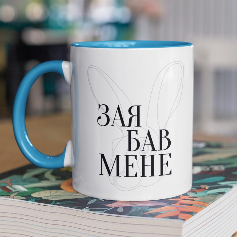 Чашка керамічна з принтом "зая бав мене" 330 мл, біла з блакитною ручкою