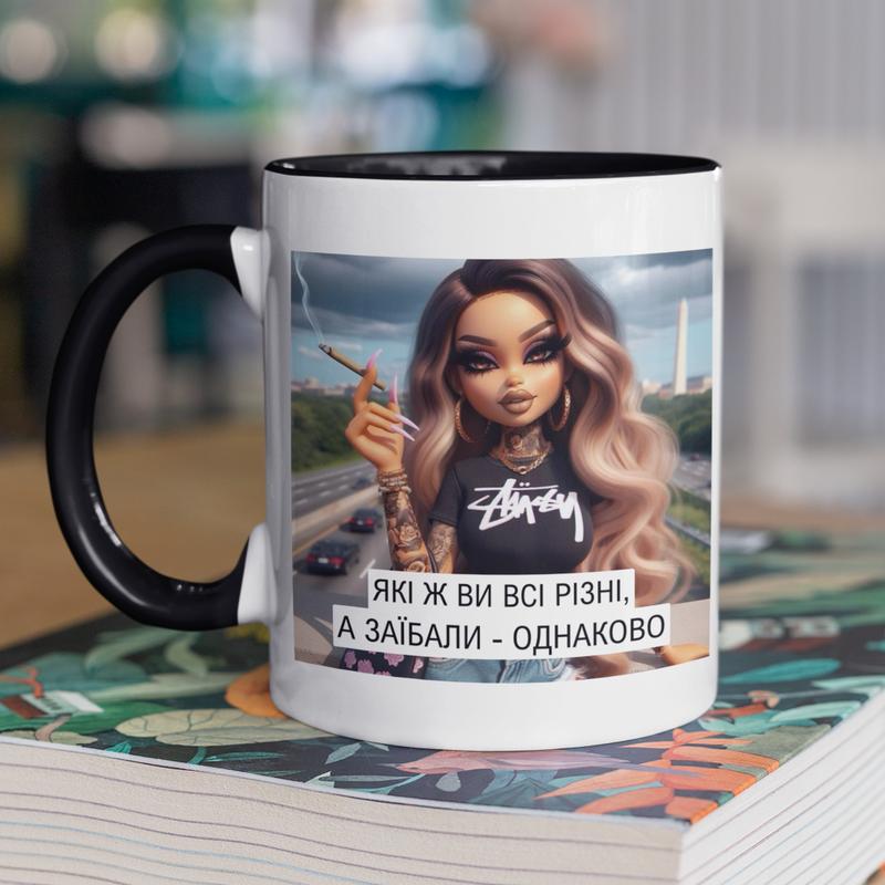 Чашка керамічна з принтом "які ж ви всі різні" 330 мл, біла з чорною ручкою