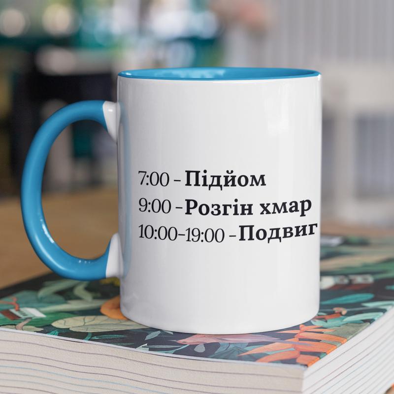 Чашка керамічна з принтом "подвиг" 330 мл, біла з блакитною ручкою
