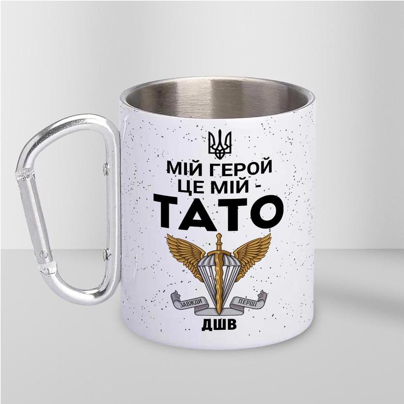 Чашка металева з принтом "мій герой це мій тато" 300 мл з карабіном, біла