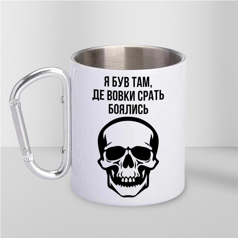 Чашка металева з принтом "я був там де вовки боялись" 300 мл з карабіном, біла