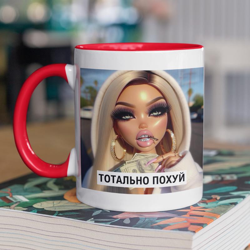 Чашка керамічна з принтом "тотально по*уй" 330 мл, біла з червоною ручкою