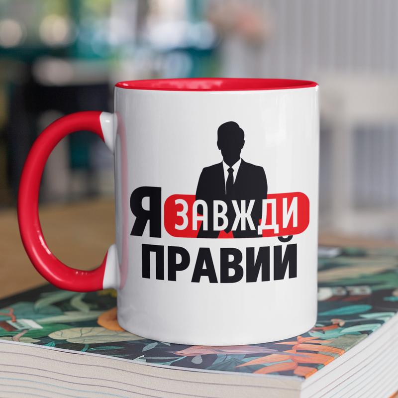 Чашка керамічна з принтом "я завжди правий" 330 мл, біла з червоною ручкою