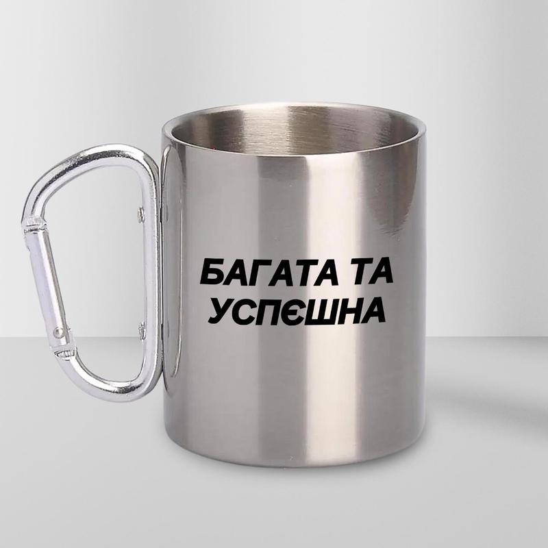 Чашка металева з принтом "багата та успєшна" 300 мл з карабіном, срібляста