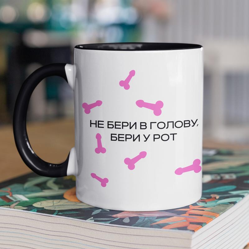 Чашка керамічна з принтом "не бери в голову" 330 мл, біла з чорною ручкою