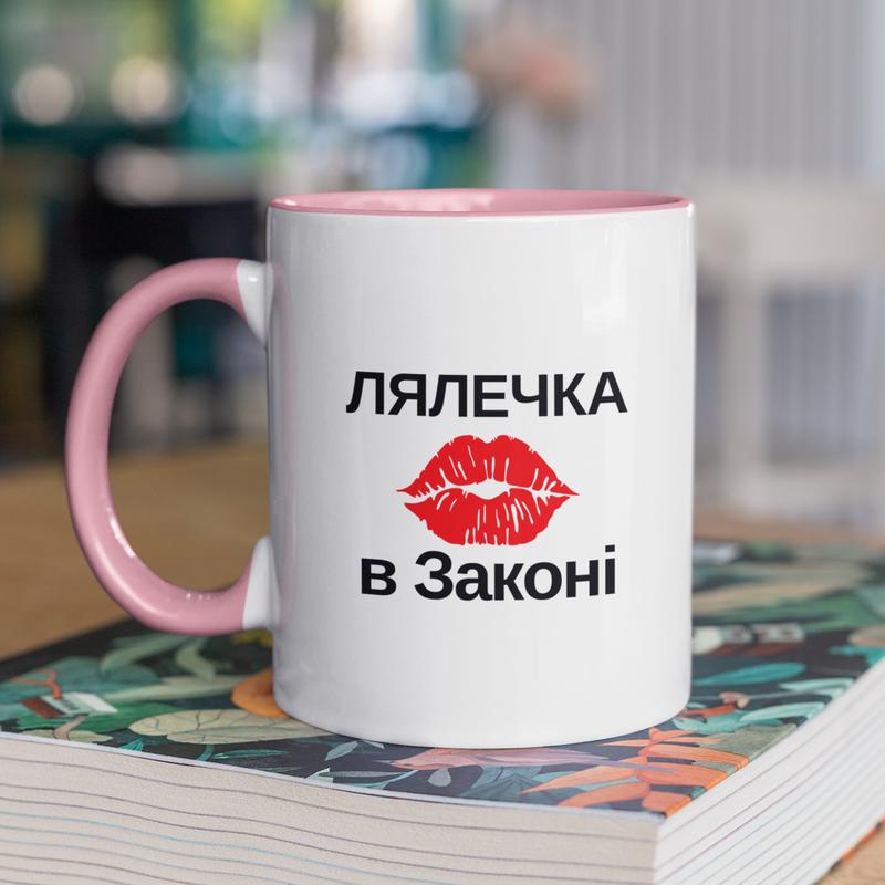 Чашка керамічна з принтом "лялечка в законі" 330 мл, біла з рожевою ручкою