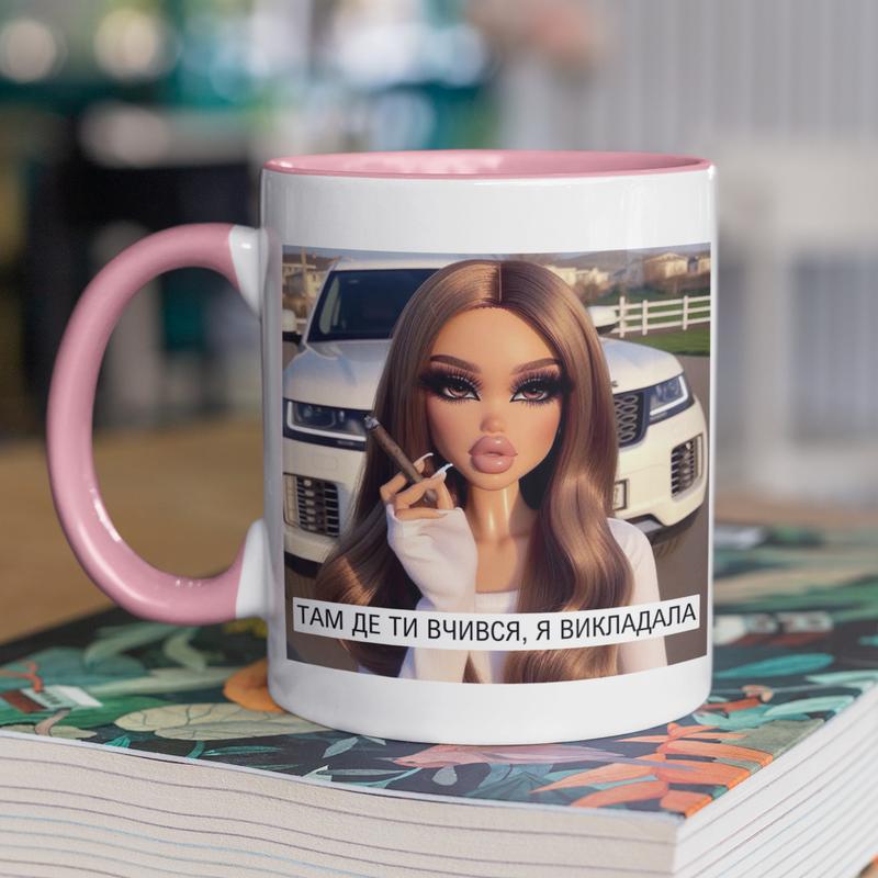 Чашка керамічна з принтом "там де ти вчився я викладала" 330 мл, біла з рожевою ручкою